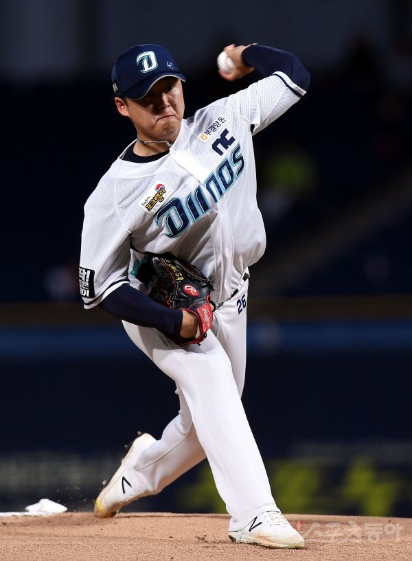 24일 경남 창원NC파크에서 ‘2019 신한은행 MY CAR KBO리그’ NC 다이노스와 두산 베어스의 경기가 열렸다. NC 선발투수 최성영이 힘차게 볼을 던지고 있다.