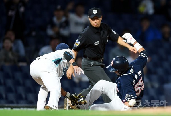 24일 경남 창원NC파크에서 ‘2019 신한은행 MY CAR KBO리그’ NC 다이노스와 두산 베어스의 경기가 열렸다. 5회초 2사 1루에서 두산 이흥련이 1타점 3루타를 날린 뒤 세이프 되고 있다.
