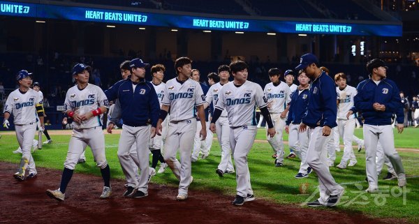 NC가 연장전 끝에 두산과 7-7 무승부를 기록한 뒤 선수들이 더그아웃으로 향하고 있다.