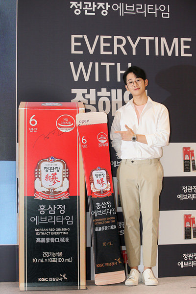국내산 6년근 홍삼농축액에 정제수만 넣은 정관장 에브리타임은 간편한 스틱형 포장으로 휴대와 섭취가 간편해 모든 연령대에서 인기가 높다. 사진은 정관장 에브리타임 모델 정해인. 사진제공|KGC인삼공사
