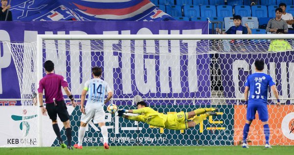 25일 수원월드컵경기장에서 ‘하나원큐 K리그1 2019’ 수원 삼성과 울산 현대의 경기가 열렸다. 전반 수원 삼성 골키퍼 노동건이 프리킥을 몸을 날려 막아내고 있다.