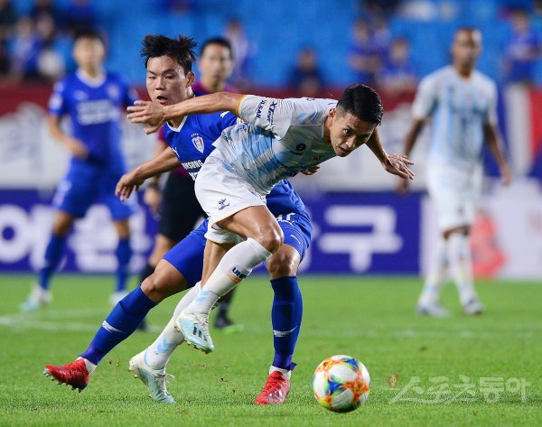 25일 수원월드컵경기장에서 ‘하나원큐 K리그1 2019’ 수원 삼성과 울산 현대의 경기가 열렸다. 전반 울산 현대 신진호가 수원 삼성 고명석과 볼 경합을 벌이고 있다.