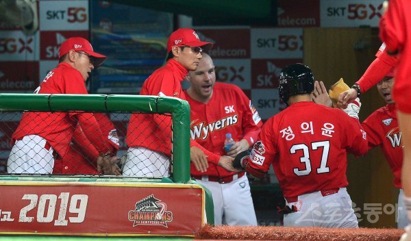 25일 인천 SK행복드림구장에서 ‘2019 신한은행 MY CAR KBO리그’ 삼성 라이온즈와 SK 와이번스 경기가 열렸다. 4회말 무사 SK 정의윤이 좌월 솔로 홈런을 날리고 그라운드를 돌아 홈인해 염경엽 감독의 축하를 받고 있다.