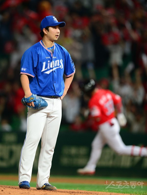 25일 인천 SK행복드림구장에서 ‘2019 신한은행 MY CAR KBO리그’ 삼성 라이온즈와 SK 와이번스 경기가 열렸다. 선발 투수로 등판한 삼성 최채흥이 4회말 무사 SK 정의윤에게 좌월 솔로 홈런을 허용하고 있다.