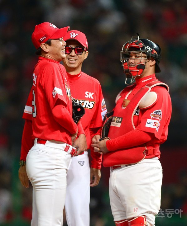 25일 인천 SK행복드림구장에서 ‘2019 신한은행 MY CAR KBO리그’ 삼성 라이온즈와 SK 와이번스 경기가 열렸다. 선발 투수로 등판한 SK 김광현이 4회초 2사 상황에서 볼넷을 허용하자 손혁 코치가 마운드에 올라 이야기 하고 있다.