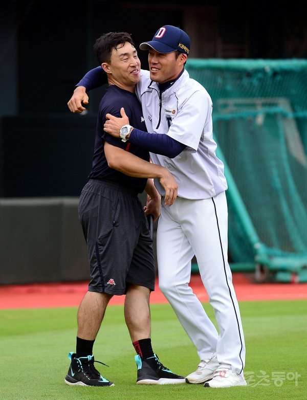 25일 부산 사직야구장에서 ‘2019 신한은행 MY CAR KBO리그’ 롯데 자이언츠와 두산 베어스의 경기가 열린다. 경기 전 두산 조성환 코치가 롯데 손아섭과 인사를 나누고 있다.