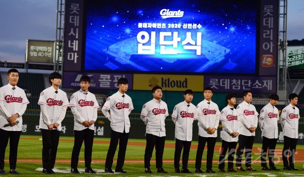 25일 부산 사직야구장에서 ‘2019 신한은행 MY CAR KBO리그’ 롯데 자이언츠와 두산 베어스의 경기가 열렸다. 경기에 앞서 롯데 2020 신인선수들의 입단식이 열리고 있다.