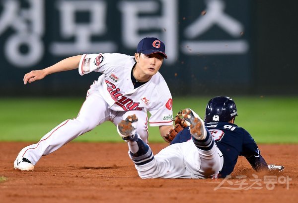 25일 부산 사직야구장에서 ‘2019 신한은행 MY CAR KBO리그’ 롯데 자이언츠와 두산 베어스의 경기가 열렸다. 5회초 2사 1루에서 두산 박건우 타석 때 1루 주자 허경민이 2루 도루를 시도했으나 롯데 신용수에게 태그 아웃되고 있다.