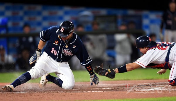 25일 부산 사직야구장에서 ‘2019 신한은행 MY CAR KBO리그’ 롯데 자이언츠와 두산 베어스의 경기가 열렸다. 6회초 1사 만루에서 두산 류지혁의 2타점 적시타 때 2루 주자 박세혁이 득점에 성공하고 있다.