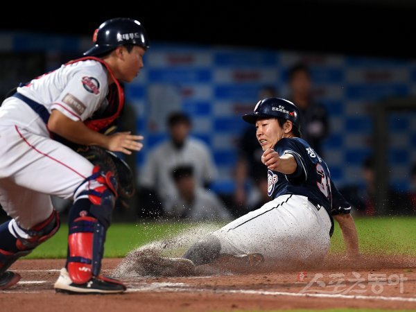 25일 부산 사직야구장에서 ‘2019 신한은행 MY CAR KBO리그’ 롯데 자이언츠와 두산 베어스의 경기가 열렸다. 6회초 1사3루에서 두산 허경민의 희생플라이 때 3루 주자 정수빈이 득점에 성공하고 있다.