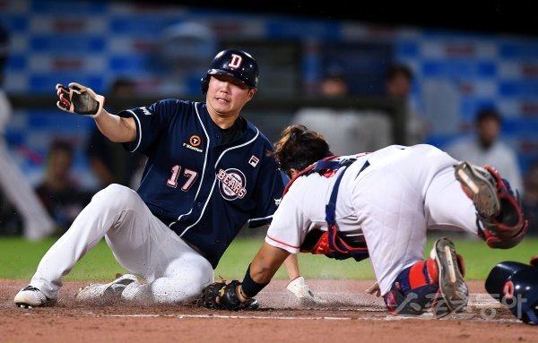 25일 부산 사직야구장에서 ‘2019 신한은행 MY CAR KBO리그’ 롯데 자이언츠와 두산 베어스의 경기가 열렸다. 6회초 1사 1, 2루에서 두산 정수빈의 2타점 2루타 때 1루 주자 류지혁이 득점에 성공하고 있다.