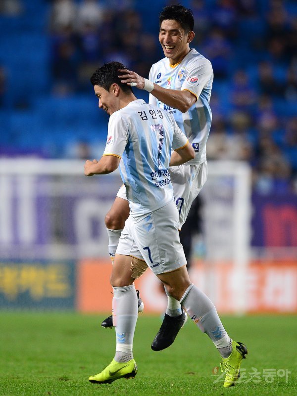25일 수원월드컵경기장에서 ‘하나원큐 K리그1 2019’ 수원 삼성과 울산 현대의 경기가 열렸다. 후반 울산 현대 김인성이 선취골을 넣은 후 윤영선의 축하를 받고 있다.