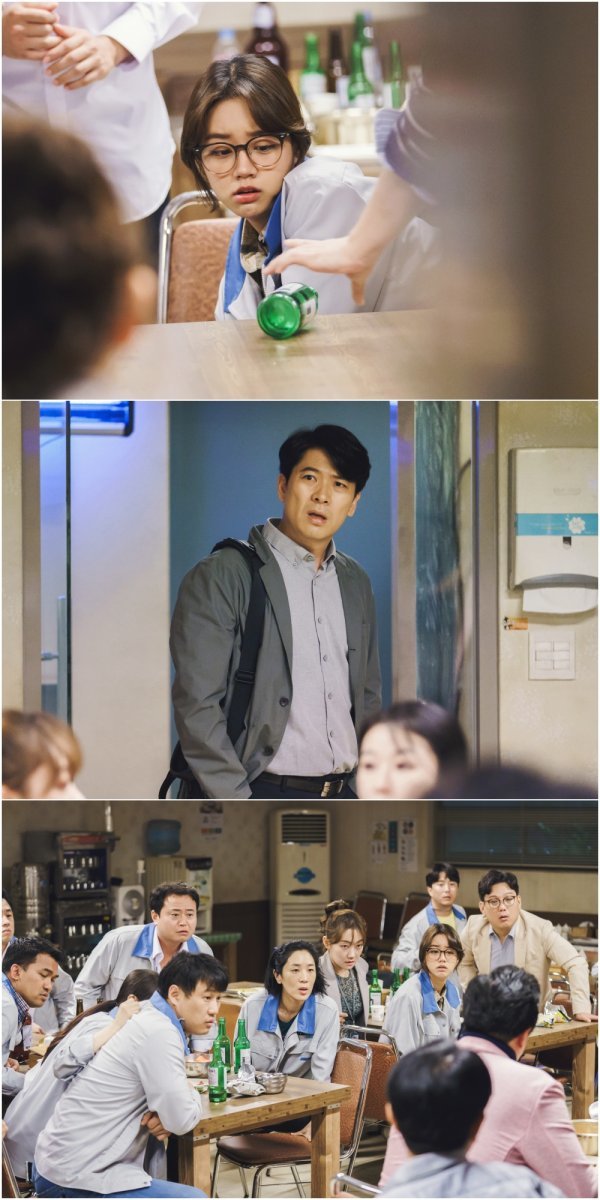 첫 방송을 앞두고 공개된 사진에는 늦은 밤 퇴근도 잊고 구내식당에 모여든 청일전자 직원들의 비상 대책 회의 현장이 담겨 있다. 착잡한 마음을 달래려고 펼친 술자리에서 장난처럼 시작된 ‘술병 룰렛’ 게임에 회사와 자신의 미래를 건 이들의 아슬아슬한 ‘한판’이 시작된다.