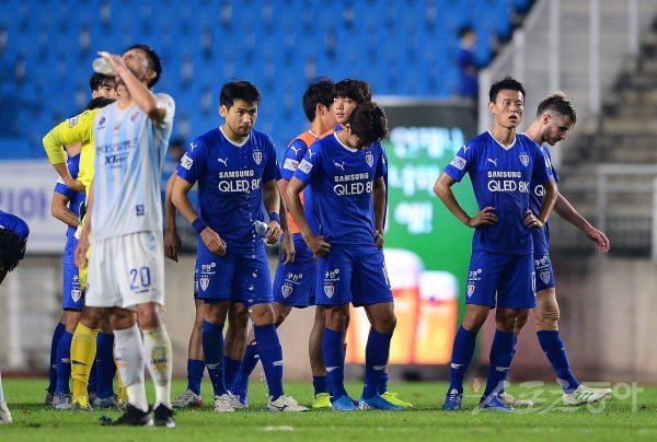 25일 수원월드컵경기장에서 열린 ‘하나원큐 K리그1 2019’ 수원 삼성과 울산 현대의 경기에서 울산 현대가 2-0 승리를 거뒀다. 경기 후 수원 삼성 선수들이 고개를 떨구고 있다.