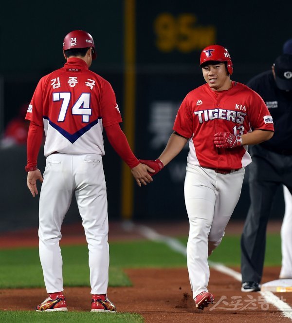 26일 부산 사직야구장에서 ‘2019 신한은행 MY CAR KBO리그’ 롯데 자이언츠와 KIA 타이거즈의 경기가 열렸다. 1회초 1사 1루에서 KIA 이창진이 좌월 투런 홈런을 쏘아 올린 뒤 김종국 코치이 환영을 받고 있다.