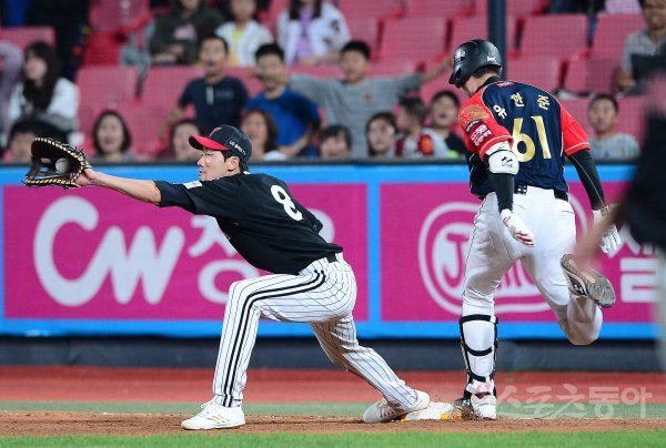 kt 유한준이 7회말 1사 1,3루에서 3루수 앞 땅볼을 친 후 세이프되고 있다.