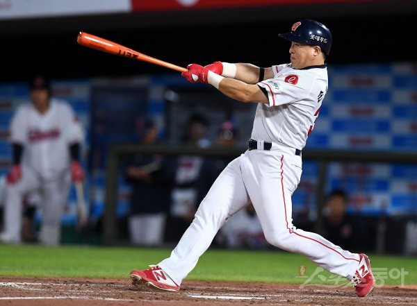 5회말 2사에서 롯데 손아섭이 2루타를 날리고 있다.