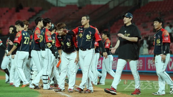kt 선수들이 경기 후 LG 선수들과 인사를 나누고 있다.