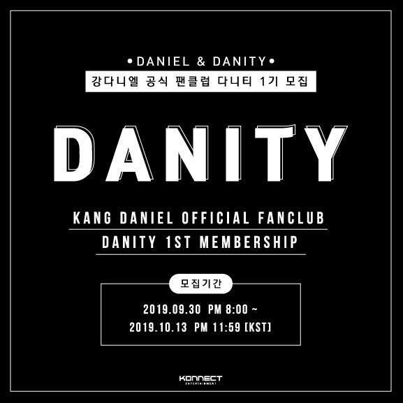강다니엘의 공식 팬클럽 \'다니티\'는 오는 30일부터 내달 13일까지 공식 홈페이지 내 숍(SHOP) 페이지에서 모집을 받으며, 활동 기간은 모집 종료 후부터 1년이다. 공식 팬클럽 회원에게는 회원카드 및 팬클럽 키트는 물론, 국내 단독 콘서트와 공식 팬클럽 행사 선예매, 공개 방송 참여 우선권 및 공식 팬카페 내 전용 공간 이용 등 다양한 혜택이 제공될 예정이다.