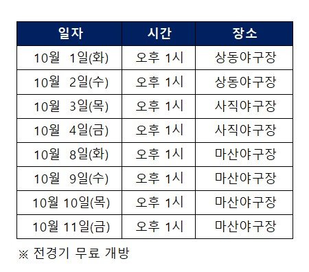 두 팀의 교류전은 10월 1∙2일 오후 1시 상동야구장, 10월 3∙4일오후 1시 사직야구장, 10월 8∙9∙10∙11일 오후 1시 마산야구장에서 열린다. 세 구장 모두 개방해 관람을 원하는 팬은 무료로 입장할 수 있다.