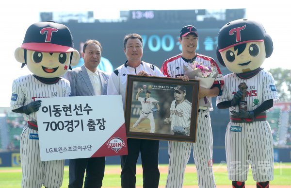 경기 전 은퇴를 하는 LG 이동현이 700경기 출장 시상식에서 임채섭 심판위원, 차명석 단장과 기념촬영을 하고 있다.