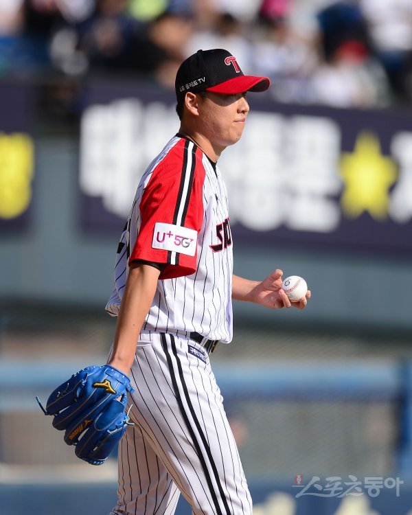 5회초 1사 2,3루 LG 차우찬이 폭투로 실점한 후 아쉬워하고 있다.