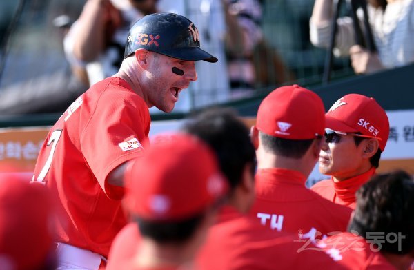7회초 1사에서 SK 로맥이 좌월 솔로 홈런을 쏘아 올린 뒤 염경엽 감독의 환영을 받고 있다.