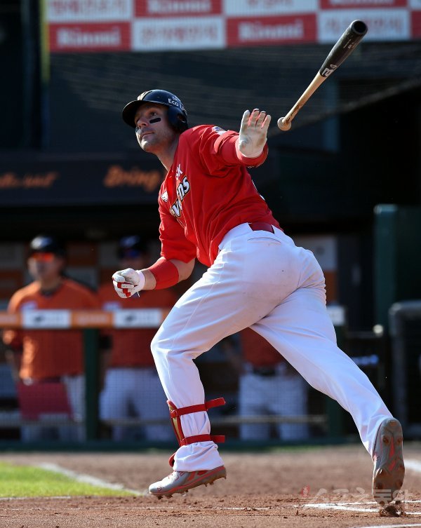 7회초 1사에서 SK 로맥이 좌월 솔로 홈런을 날리고 있다.