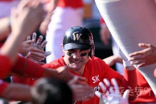 29일 대전 한화생명이글스파크에서 ‘2019 신한은행 MY CAR KBO리그’ 한화 이글스와 SK 와이번스의 경기가 열렸다. 7회초 1사에서 SK 로맥이 좌월 솔로 홈런을 쏘아 올린 뒤 동료들의 환영을 받고 있다. 대전|김민성 기자 marineboy@donga.com