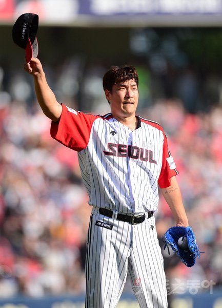 29일 서울 잠실야구장에서 ‘2019 신한은행 MY CAR KBO리그’ 두산 베어스와 LG 트윈스의 경기가 열렸다. 경기 후 은퇴식을 갖는 LG 이동현이 7회초 등판해 두산 박세혁을 삼진 아웃 시킨 후 교체되며 팬들에게 인사하고 있다. 잠실|김종원 기자 won@donga.com