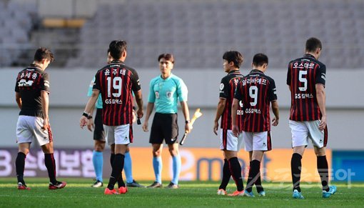 29일 서울월드컵경기장에서 열린 ‘하나원큐 K리그1 2019’ FC서울과 상주 상무의 경기에서 상주가 2-1 역전승 거뒀다. 경기 후 FC서울 선수들이 아쉬워하고 있다. 상암|김진환 기자 kwangshin00@donga.com