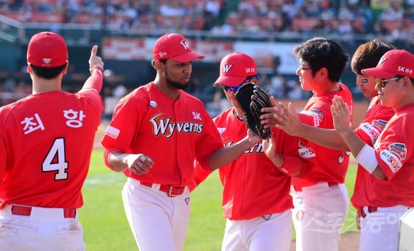 SK 선발 산체스가 7회까지 한화 공격을 무실점으로 막은 뒤 이닝 종료 후 동료들의 환영을 받고 있다.