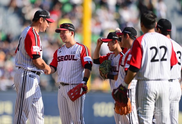 경기 후 은퇴식을 갖는 LG 이동현이 7회초 등판해 두산 박세혁을 삼진 아웃 시킨 후 교체되며 김민성과 악수하고 있다.