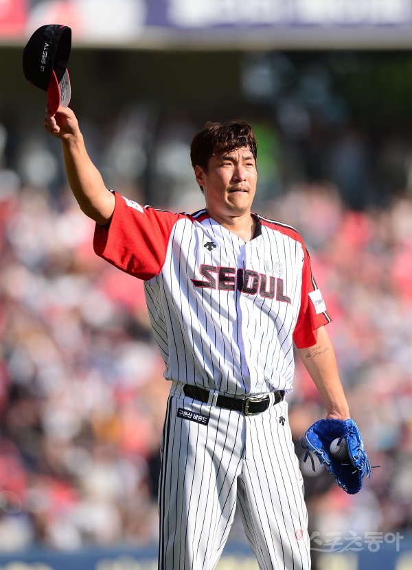 경기 후 은퇴식을 갖는 LG 이동현이 7회초 등판해 두산 박세혁을 삼진 아웃 시킨 후 교체되며 팬들에게 인사하고 있다.