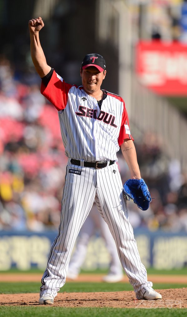 경기 후 은퇴식을 갖는 LG 이동현이 7회초 등판해 두산 박세혁을 삼진 아웃 시킨 후 환호하고 있다.