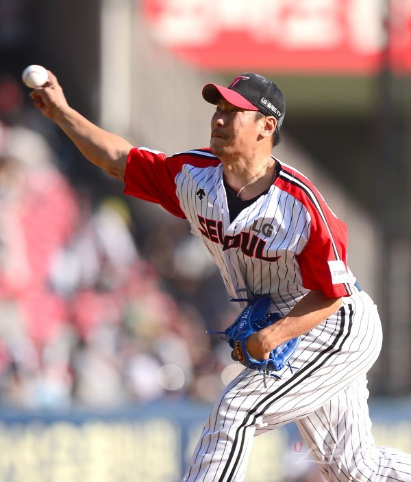 경기 후 은퇴식을 갖는 LG 이동현이 7회초 등판해 역투하고 있다.