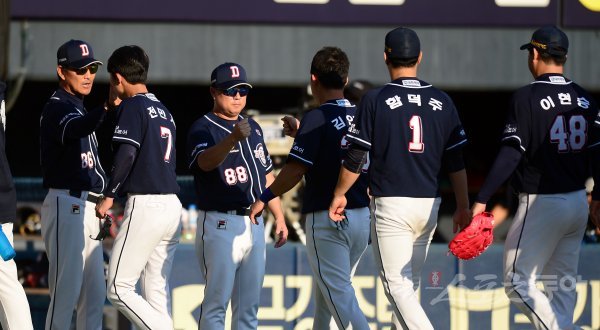 3-0 완승을 거둔 후 두산 김태형 감독이 선수들과 하이파이브하고 있다.