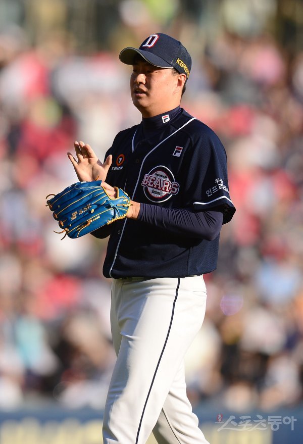 3-0 완승을 거둔 후 두산 이영하가 박수를 치고 있다.