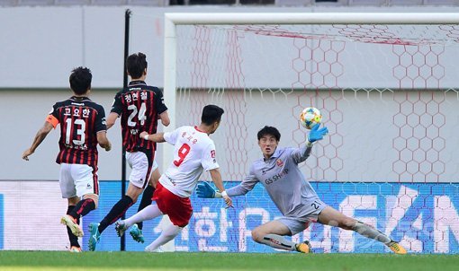 29일 서울월드컵경기장에서 ‘하나원큐 K리그1 2019’ FC서울과 상주 상무의 경기가 열렸다. 후반 상주 상무 송시우(9번)가 역전골을 넣고 있다. 상암|김진환 기자 kwangshin00@donga.com