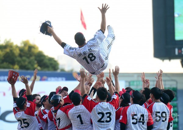 경기 종료 후 은퇴식에서 LG 이동현이 헹가래를 받고 있다.