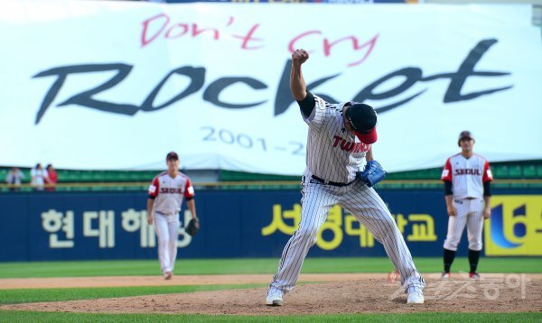 경기 종료 후 은퇴식에서 LG 이동현이 그라운드 세리머니를 하고 있다.