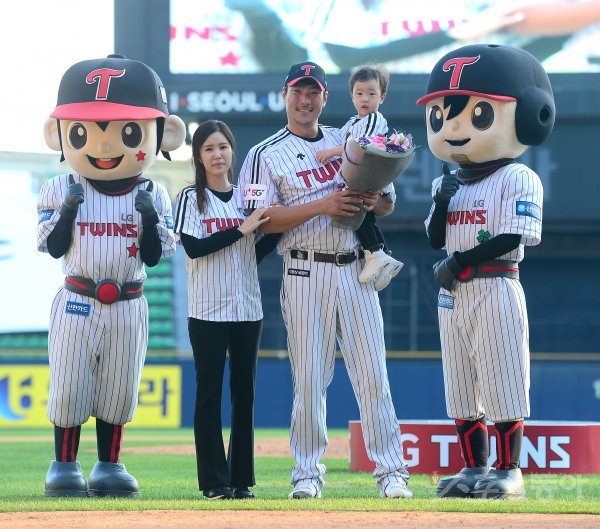 경기 종료 후 은퇴식에서 LG 이동현이 가족과 기념촬영을 하고 있다.