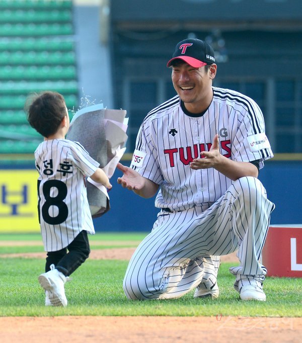 경기 종료 후 은퇴식에서 LG 이동현이 아들에게 꽃다발을 받고 있다.