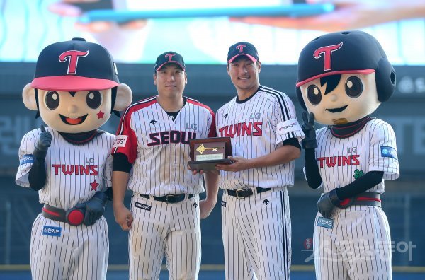 경기 종료 후 은퇴식에서 LG 이동현이 선수단 대표 김현수에게 기념 선물을 받고 있다.