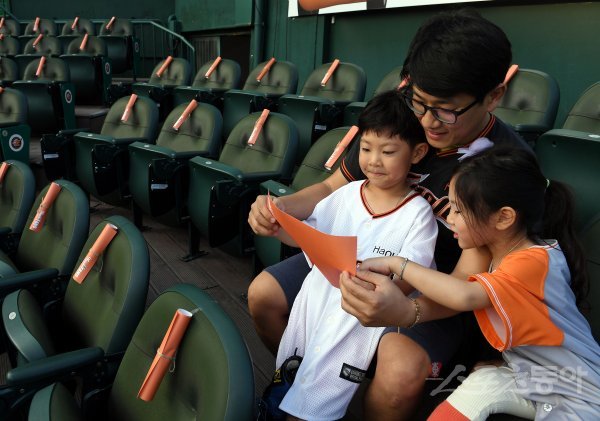 홈 피날레 행사로 한화 선수 14명이 팬들을 위해 직접 친필로 적은 손편지를 하민, 하윤 가족이 읽고 있다.