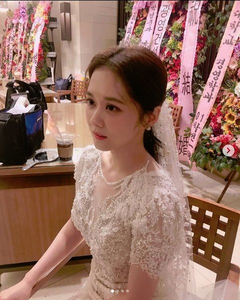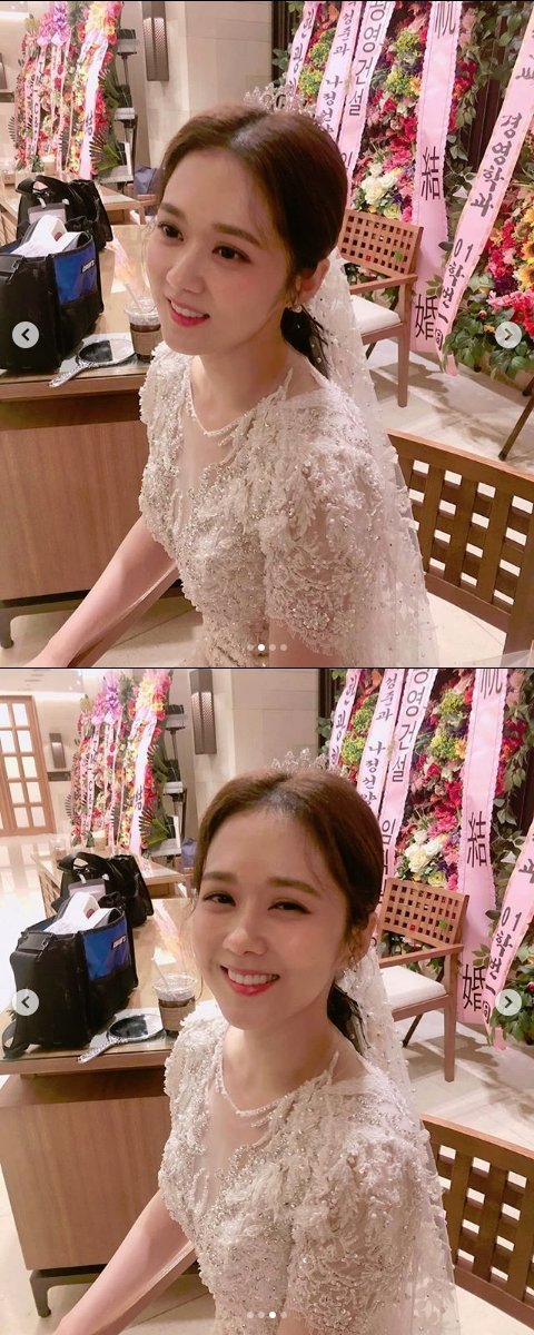 이날 장나라는 순백색 웨딩 드레스를 입고 미소를 짓고 있다. 카메라가 아닌 다른 곳을 바라보며 옆선을 공개하는 한편 정면으로 응시해 동안 미모를 자랑했다.