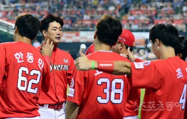 SK 선발 김광현이 6회까지 한화 공격을 1실점으로 막은 뒤 이닝 종료 후 동료들의 환영을 받고 있다.