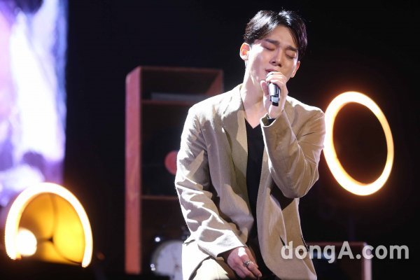 그룹 엑소의 첸이 1일 오후 서울 광진구 예스24라이브홀에서 열린 새 미니앨범 \'사랑하는 그대에게 (Dear my dear)’ 음감회에서 새로운 무대를 선보이고 있다.
