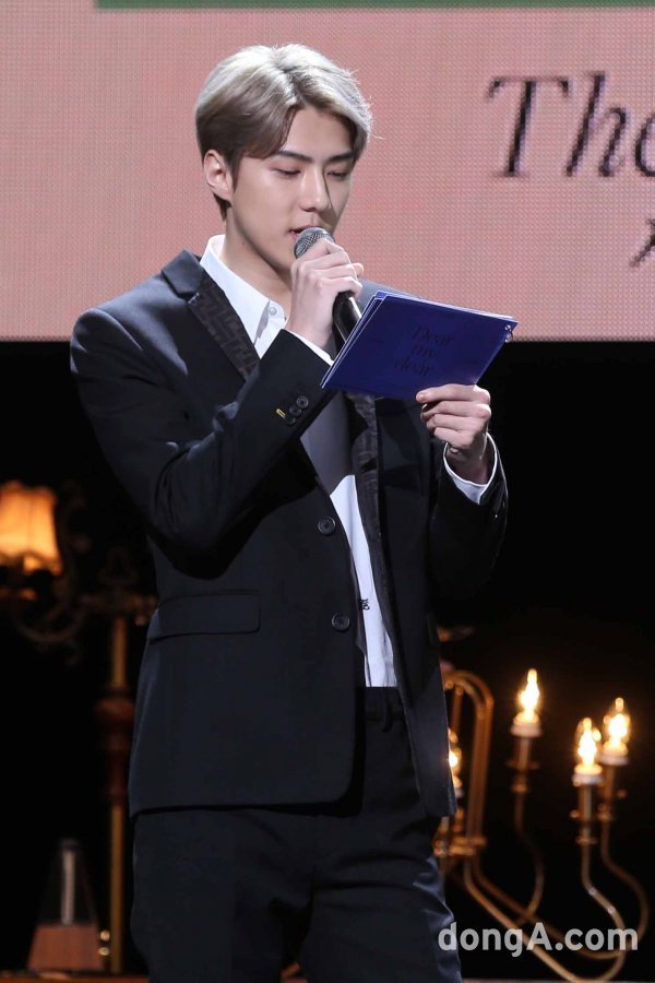 그룹 엑소의 세훈이 1일 오후 서울 광진구 예스24라이브홀에서 열린 첸의 새 미니앨범 \'사랑하는 그대에게 (Dear my dear)’ 음감회에서 사회를 보고 있다.
