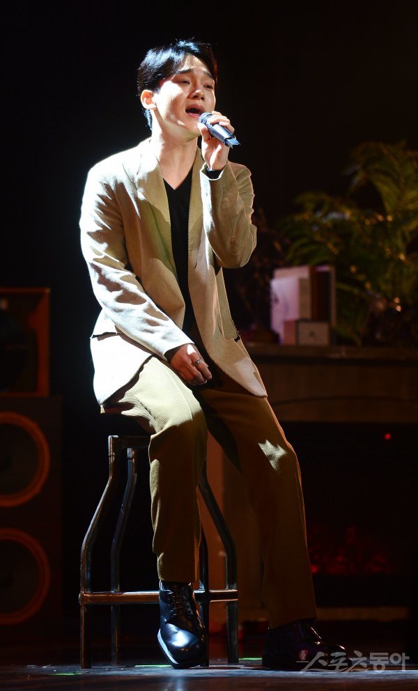 엑소 첸이 1일 서울 광진구 예스24 라이브홀에서 가진 두 번째 미니앨범 ‘사랑하는 그대에게 (Dear my dear)’ 발매 음감회에서 공연을 펼치고 있다.